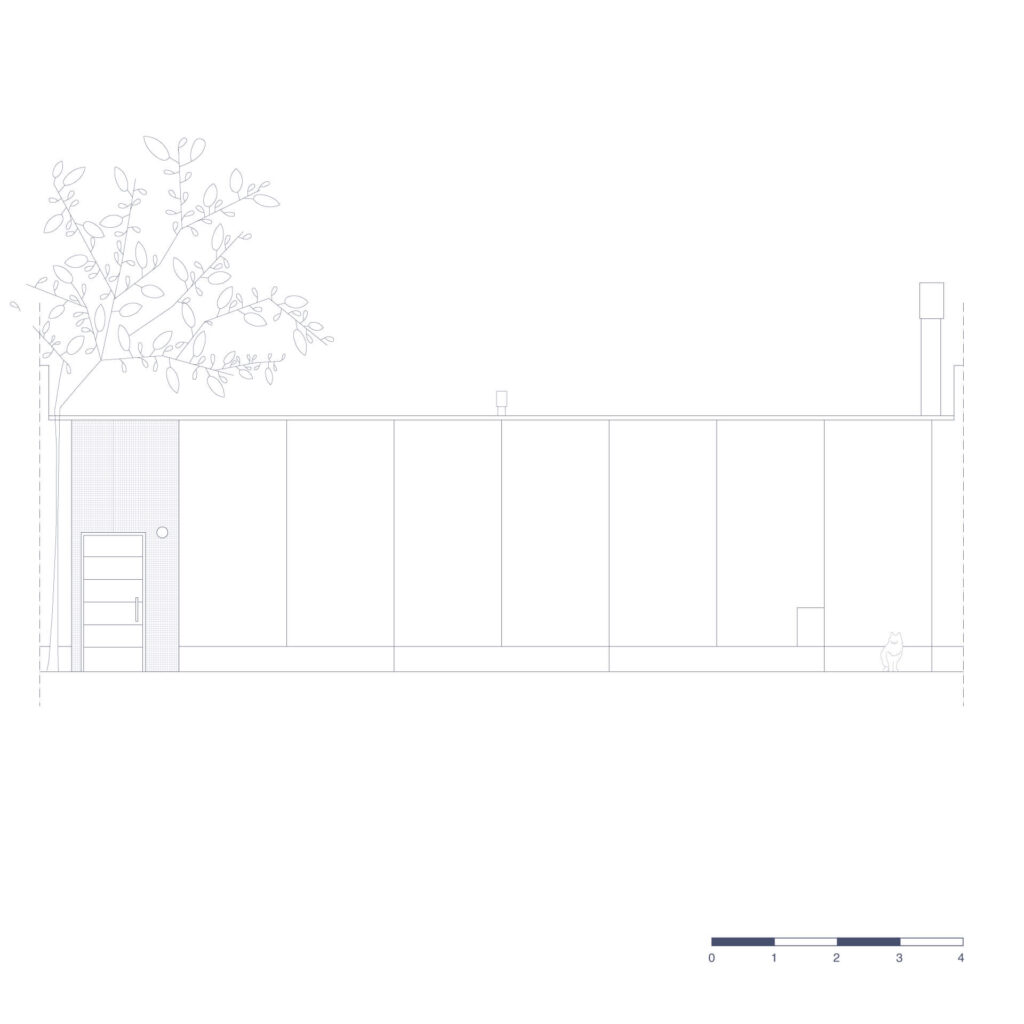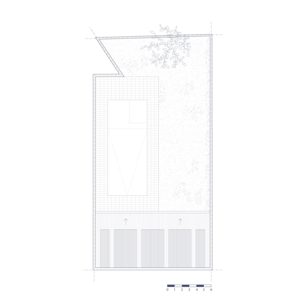 El edificio se dispone sobre la línea oficial, aprovechando los muros existentes y preservando el vacío del terreno como protagonista. Hacia el interior, el programa incluye una cocina, un baño, amplios espacios de guardado y una parrilla, dispuestos sobre el perímetro para liberar un