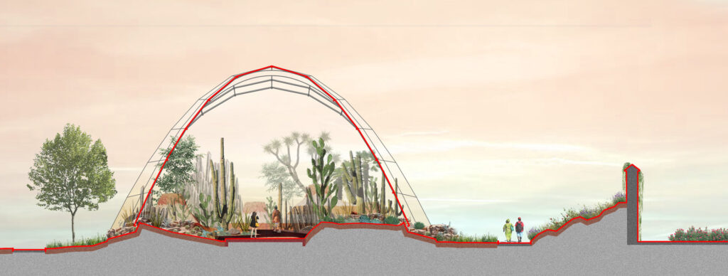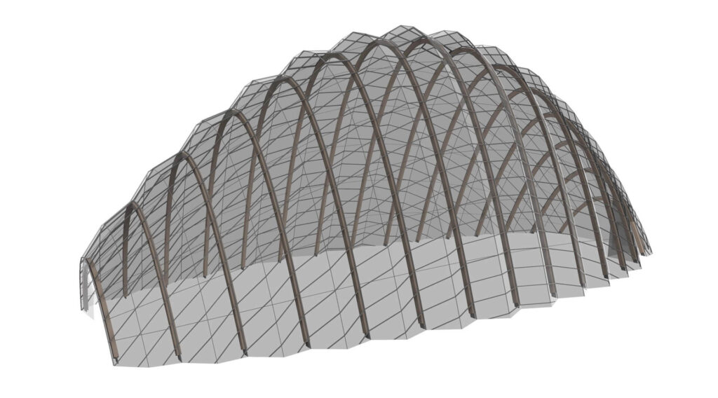 organiza a partir de una serie de arcos parabólicos idénticos inclinados a 15 grados y unidos mediante cables de acero en catenaria. Esta geometría repetitiva y tensada genera una envolvente ondulante que suaviza su perfil contra el paisaje y crea las condiciones de luz y ventilación adecuadas para especies de climas secos. Ambos invernaderos fueron desarrollados a través de un modelado paramétrico que permitió explorar variantes formales y estructurales hasta definir la configuración final.