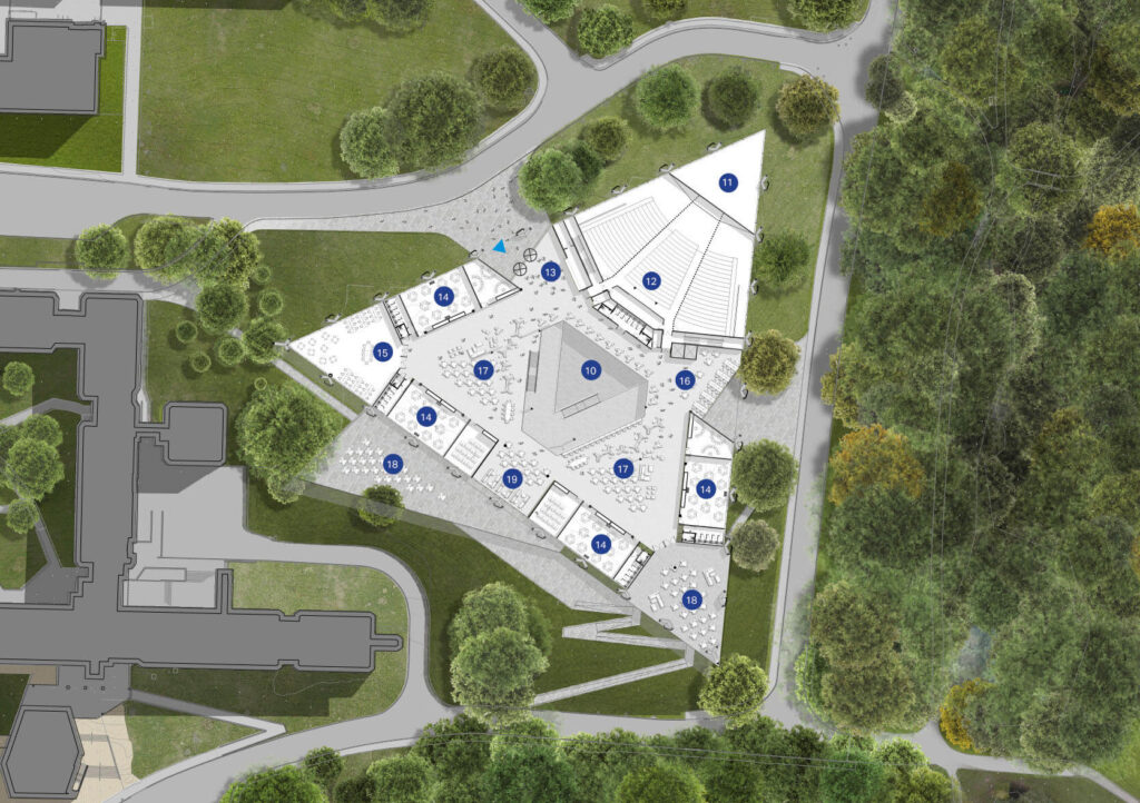niveles superiores contienen seminarios, salas de estudio y áreas de encuentro, todo integrado por una secuencia espacial abierta y flexible. La estructura combina acero y madera laminada cruzada (CLT), con columnas en forma de “Y” y cubiertas plegadas que integran lucernarios y superficies verdes, enfatizando la sostenibilidad y el vínculo con el paisaje.