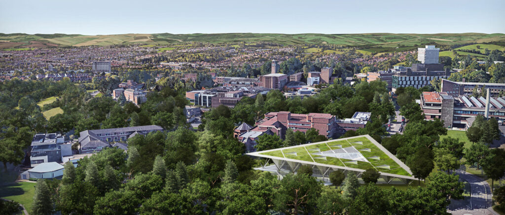 El concurso para el nuevo edificio “Project Exceptional” de la University of Exeter proponía reunir en una sola pieza tres áreas de investigación —Sistemas Globales, Astrofísica y Humanidades y Ciencias Sociales— junto con espacios docentes y de encuentro. La propuesta se organiza en torno a un gran atrio central de cuatro niveles, que articula los diferentes programas y promueve la interacción entre disciplinas. El edificio adopta una forma triangular que se adapta a la topografía del campus y genera una identidad distintiva dentro del conjunto universitario.