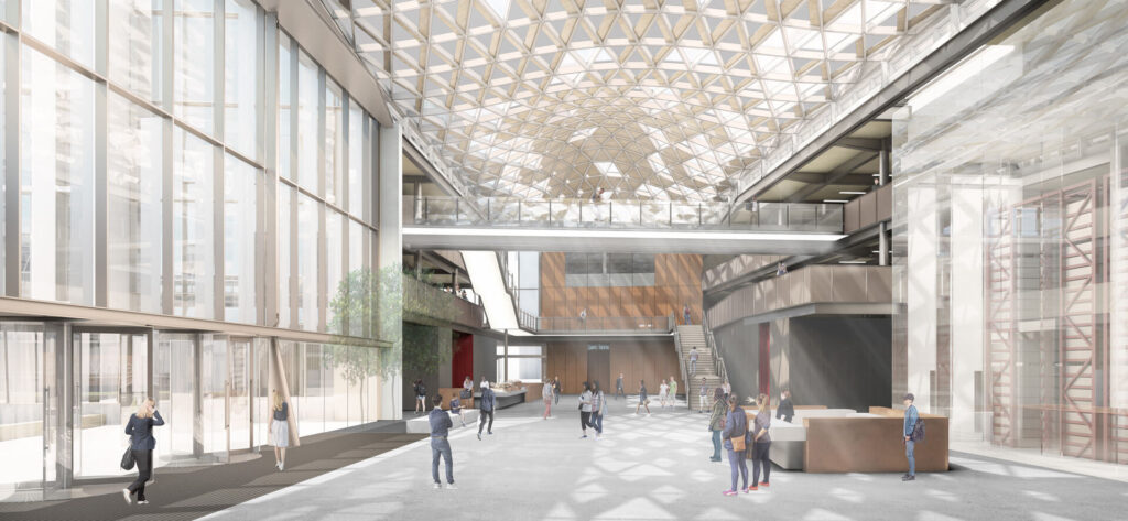 El proyecto St George’s Quarter constituye una pieza clave dentro del plan maestro de renovación del campus de London South Bank University en Southwark. Concebido como el nuevo “Portal de Entrada” de la universidad, el conjunto articula un gran espacio público cubierto —el atrio central— que conecta dos edificios y genera un verdadero corazón cívico para la institución. Integrando la restauración del antiguo templo presbiteriano de 1846, convertido