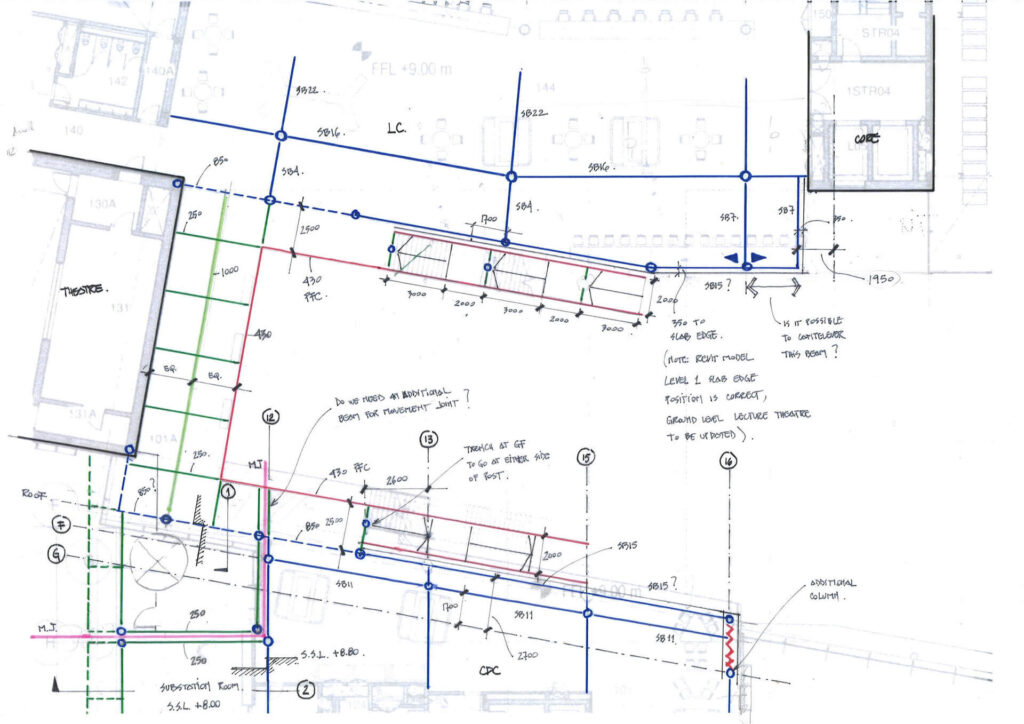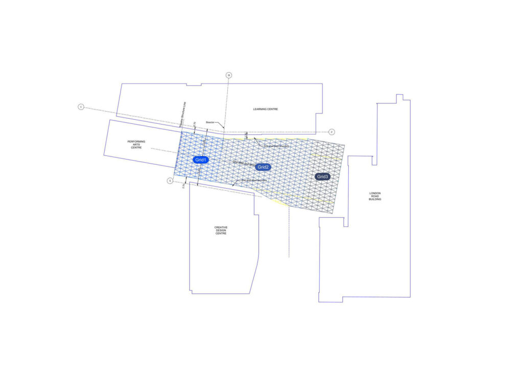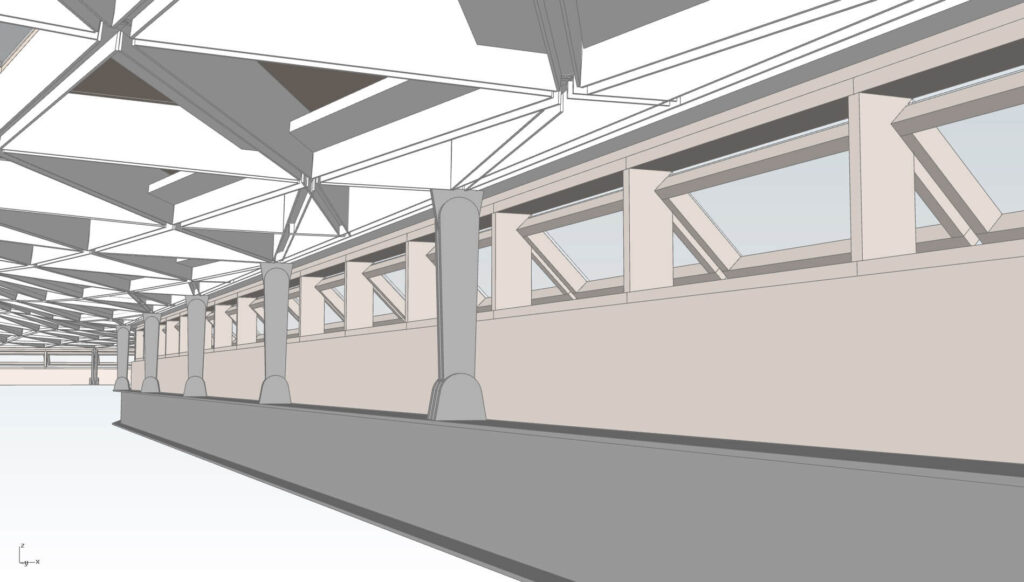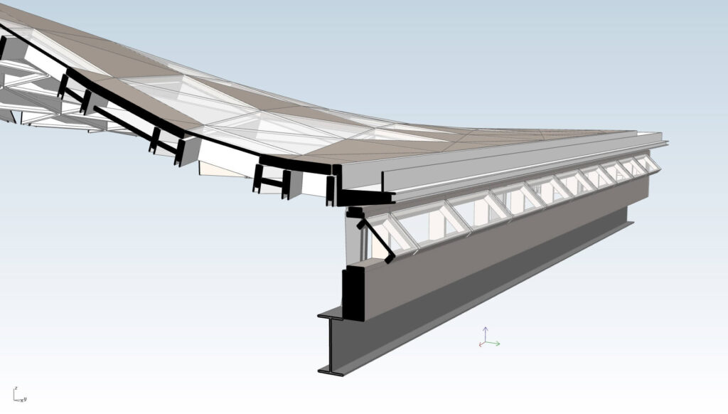 una alineación armónica con los edificios adyacentes y dimensiones de paneles adecuadas. Se definieron tres grillas sutilmente diferentes que permiten articular la cubierta con cada edificio, variaciones casi imperceptibles a la vista pero fundamentales para el ajuste estructural y geométrico.