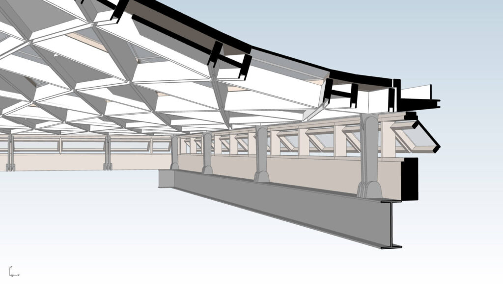 Esta cáscara está concebida de modo tal que no genera empujes laterales: su propia geometría absorbe las fuerzas horizontales y transmite únicamente las cargas gravitatorias a los edificios adyacentes. Los posibles movimientos de dilatación o las acciones de viento se resuelven mediante apoyos articulados distribuidos en todo el perímetro del techo, que permiten independencia estructural entre los distintos volúmenes.