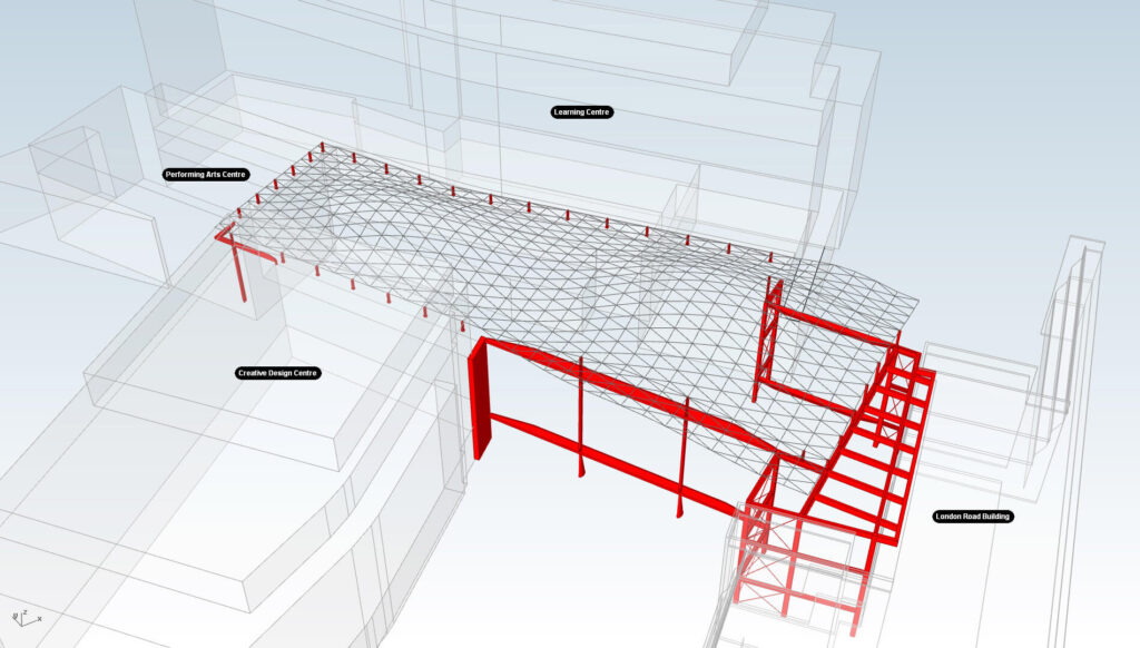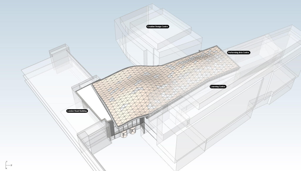 La cubierta del atrio constituye uno de los elementos distintivos del proyecto, configurando una gran “calle interior” que articula los distintos edificios del conjunto. Su estructura se resuelve mediante una cáscara reticulada metálica (grid shell) organica, compuesta por una trama triangular continua que adopta una forma sinusoidal de doble cúpula —una al